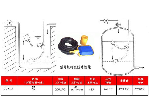 电缆浮球液位开关是一个能够调节桶、槽或井中液位的控制装置。它可自动调节,易于操作,便于安装,安全可靠,免予维修,无毒环保。它对污水有抵抗作用,广泛应用于家庭,厂矿等的水池,油,酸和碱的池,桶,槽,灌等的容器中。如果联两个控制器。一个放至水塔,另一个放至水井中控制水泵,就能防止因水源不足开空泵而损坏水泵设备;也可以三有控制器串联,一个放至水塔,另一个放过滤池和一个放至河水(水井)能同时控件,就能防止因水源不足开空泵而损坏水泵设备;也可以三个控制器串联,一个放至河水(水井)能同时控制两台水泵设备.